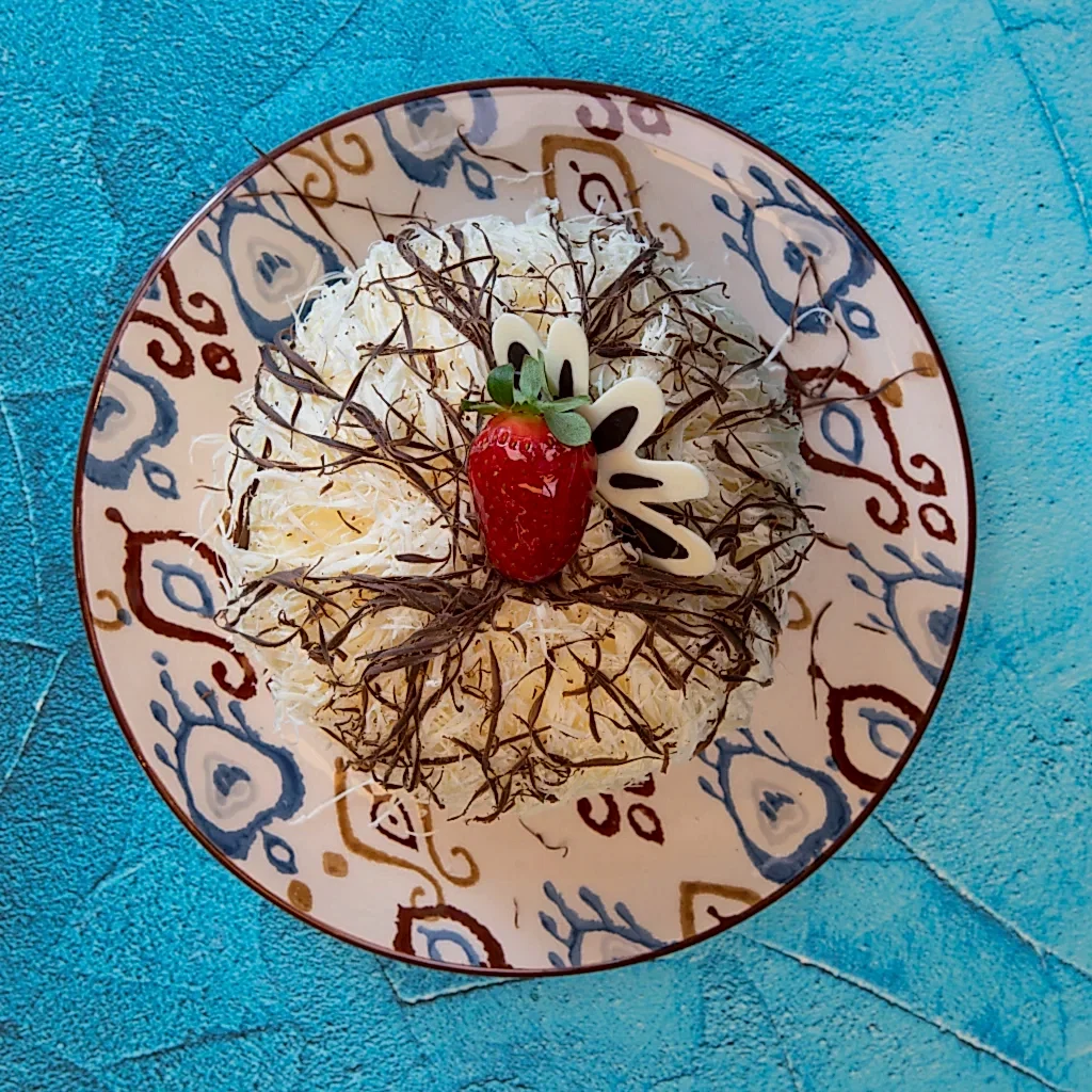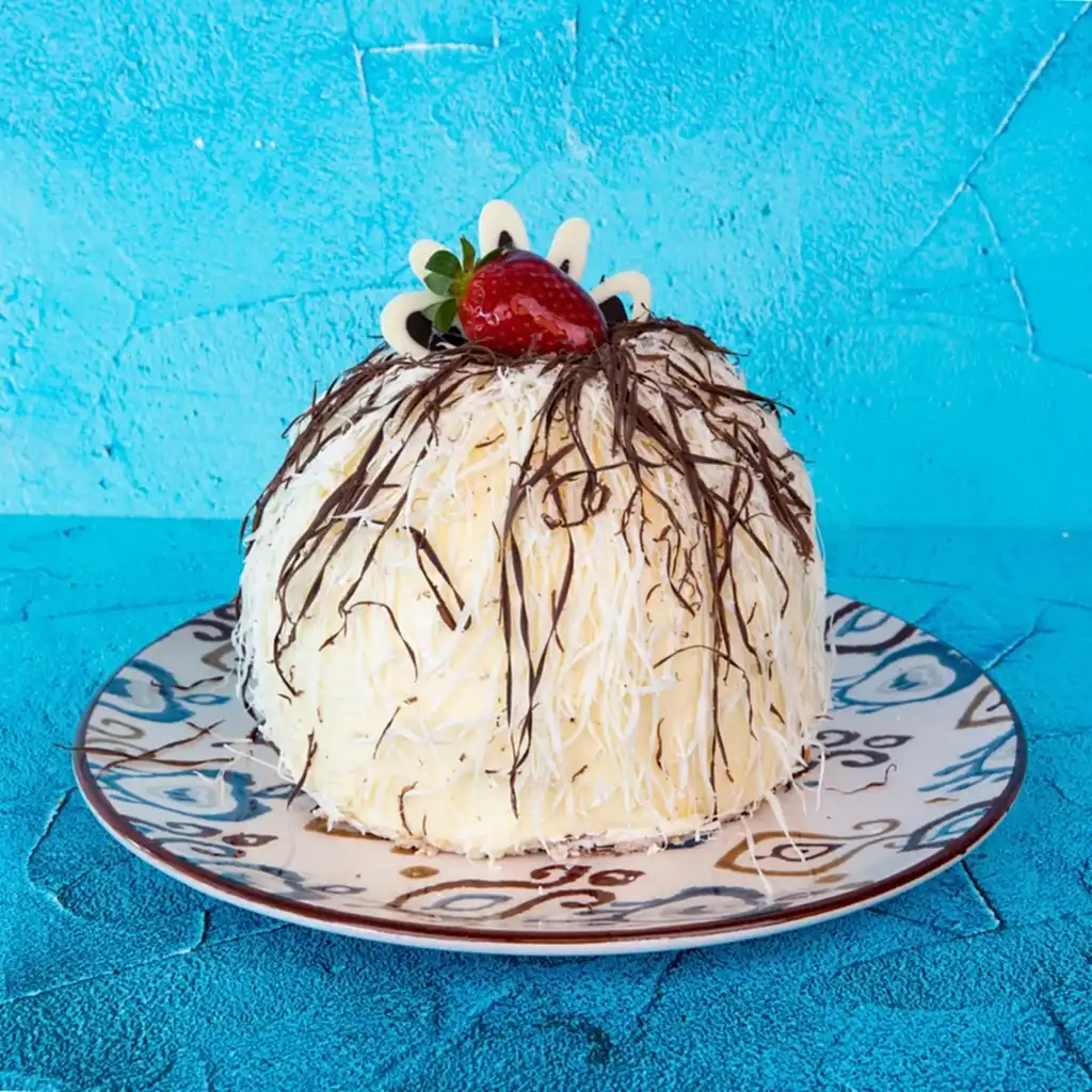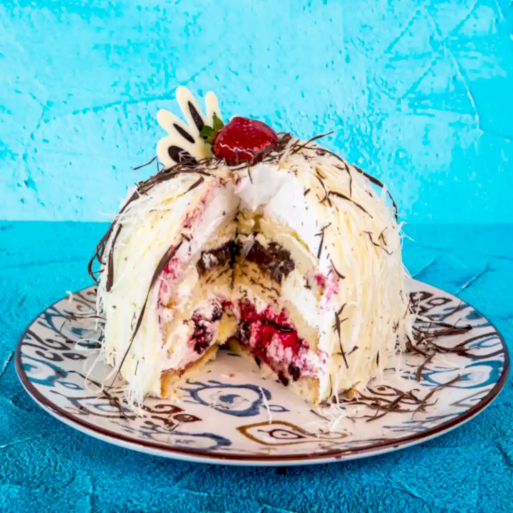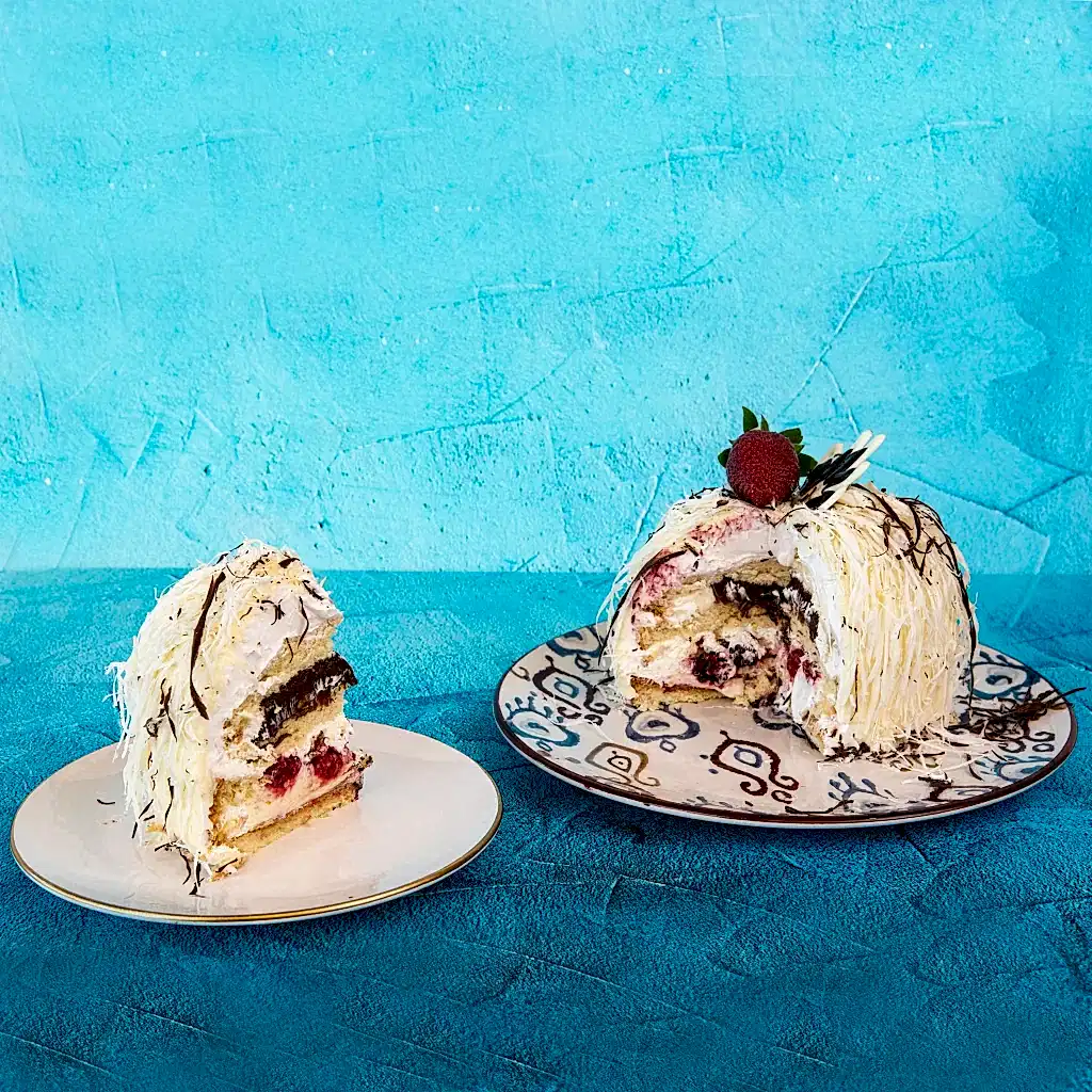 Vanilyalı Pandispanya,Beyaz Çikolatalı Prenses ve Pastacı Kreması, Kırmızı Meyveler ve Akışkan Çikolata Sosu, Dışı Beyaz Çikolatalı Ganaj kaplamalı